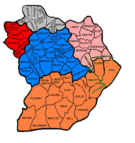 NOTE: The Eastern District is in blue and its counties are shown below. The Lexington Division is Blue, Frankfort Red, Ashland Pink, Covington Grey, London Orange